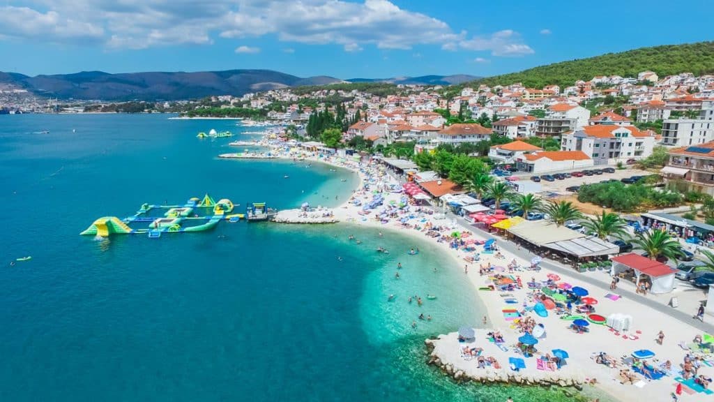 The most popular beach near Trogir — a long pebble beach on Čiovo island with crystal-clear water, beach bars, and stunning views across the channel. Just 10 minutes by scooter.